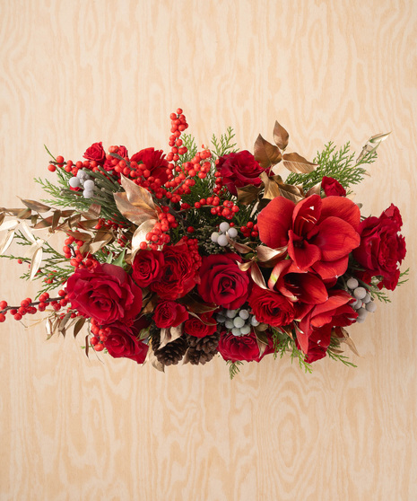 Gifting season galore and there’s nothing more luxurious than visiting Americana Manhasset, a luxury shopping center housing iconic brands. The center annually decks it out with artful holiday decorations and hosts charitable events like “Champions for Charity” that benefit not-for-profit organizations. Taking inspiration, the “Americana Holiday,” is a luxurious arrangement that embodies the season of giving. Featured flowers are trumpet-shaped Amaryllis, velvet-soft mixed Roses, and layered Ranunculus nestled with Italian pinecones and paired with glamorous metallic accents. Tufts of fresh Cedar evergreens styled in a keepsake gold vessel softens and refines.
