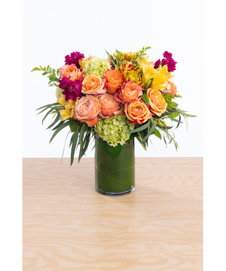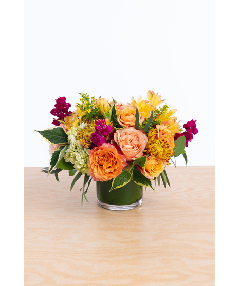 Like the cozy warmth of a campfire glow, this arrangement features seasonal varieties of antique coral and bi-color crimson-yellow roses, accented with golden-bronze chrysanthemums, plush mini green hydrangeas, ruby-red stock, and cheerful yellow highlights. Share the warmth of the season with the “Campfire Glow.”