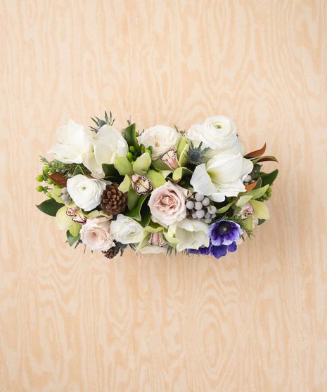 This talk-worthy centerpiece is filled with crisp green cymbidium orchids, velvety snow-white amaryllis, layered ranunculus, two-varieties of ruffled Garden Roses, blue Italian Anemones, starry thistle and accents of green berries and silver baubles. Rustic brown pinecones, textured evergreens, and Magnolia foliage delicately frame this unique long and low arrangement.