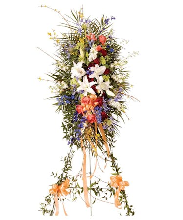A beautiful standing tribute featuring white lilies, yellow forsythia, blue delphinium and pink roses. A wonderful tribute to someone's memory. Multiple sizes shown- choose your favorite! Dimensions may vary.