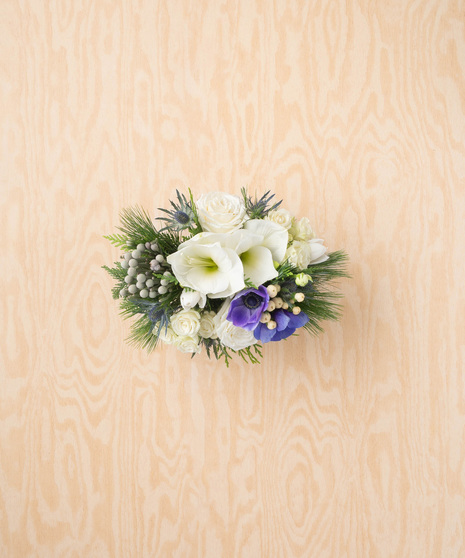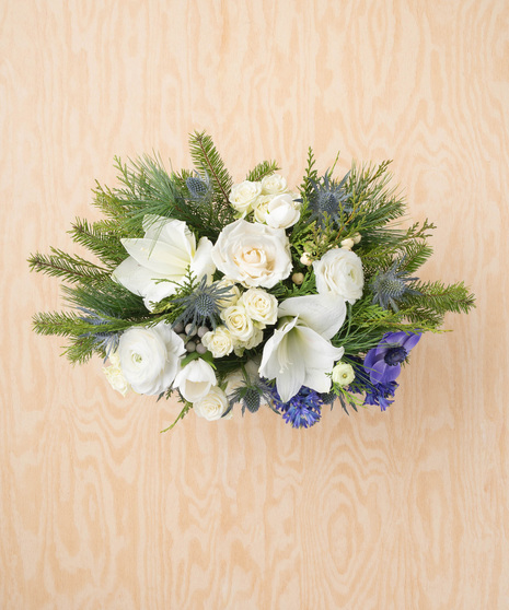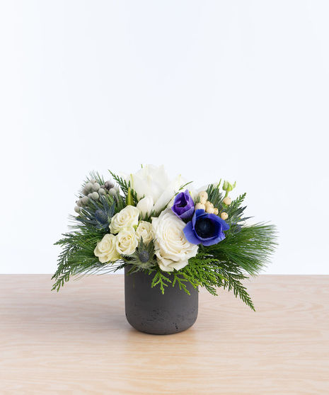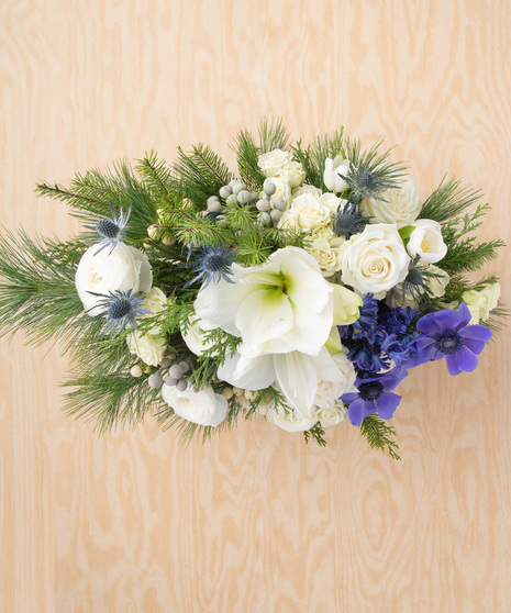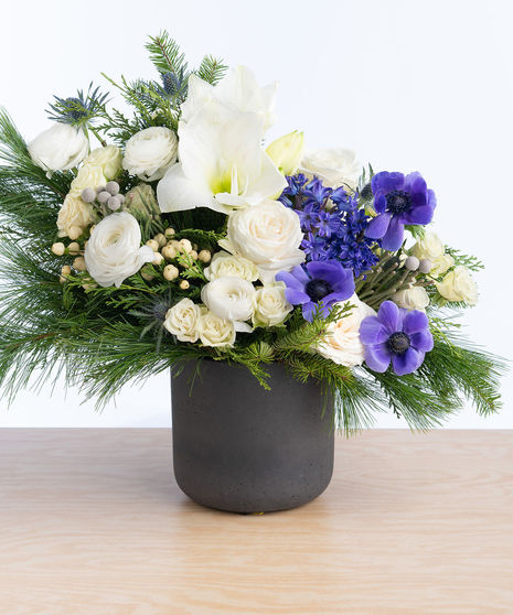 Step into a tried and true winter color palette of whites, blues, and accents of silver to mirror the crisp and refreshing season of renewal. Here, snow-white amaryllis, mixed garden roses, ranunculus, tulips, anemones, and hyacinths. Cool-toned embellishments and verdant evergreens styled in a textured fiberclay vase create the perfect serene scene.