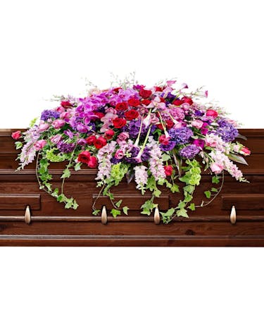 A beautiful casket spray filled with rich colors and delicate touches of soft greenery. Multiple sizes shown- choose your favorite! Dimensions may vary.