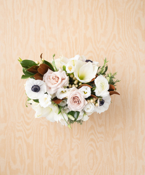 When the air turns frosty, twinkling lights are strung, and bells are ringing, wintertime has begun. Mirroring wintertime’s wonder, the “Jingle Bell Time” design magnificently feature showy amaryllis, mixed white and blush velvety garden roses, ruffled ranunculus, delicate lisianthus, tulips, anemones and glimmering berries. Bringing it all together are tufts of ‘Juniper’ evergreens and magnolia foliage dressed in a bell-shaped gold vessel.