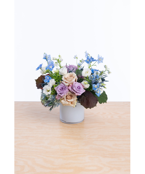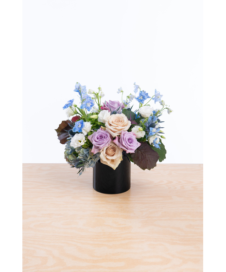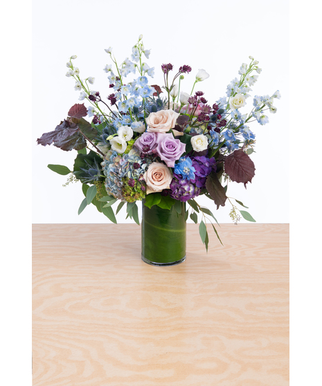 This enchanting display features plush novelty hydrangeas, ruffled garden roses, twinkling thistle, airy lisianthus, lofty delphiniums, and delicate astrantia, accented with leafy plum foliage. Designed in a simple leaf-lined glass vase, it brings a touch of magic and sophistication to any setting.