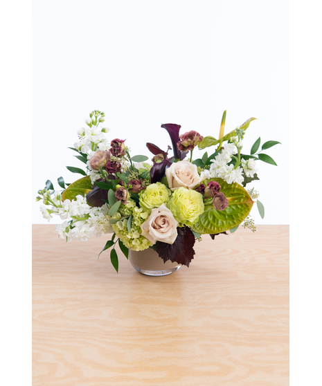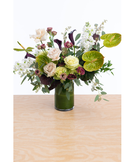 This neutral-toned design brims with transitional shades of olive green, reminiscent of the ripening stages of the prized fruit. Glossy earthy-green anthuriums, ruffled cabbage-green roses, and plush chartreuse mini hydrangeas are paired with beige-blush garden roses, copper-plum lisianthus, white stock, and black calla lilies. Seasonal textural accents complete the palette, arranged beautifully in a leaf-lined glass vase.