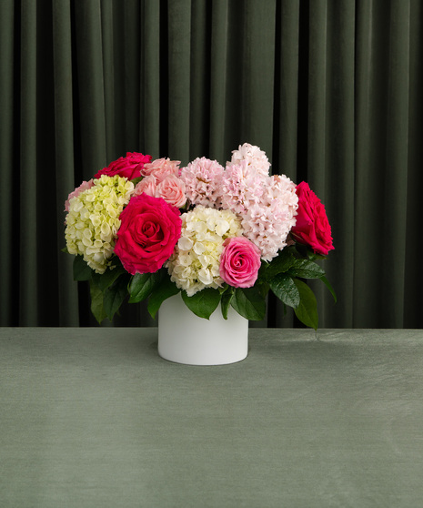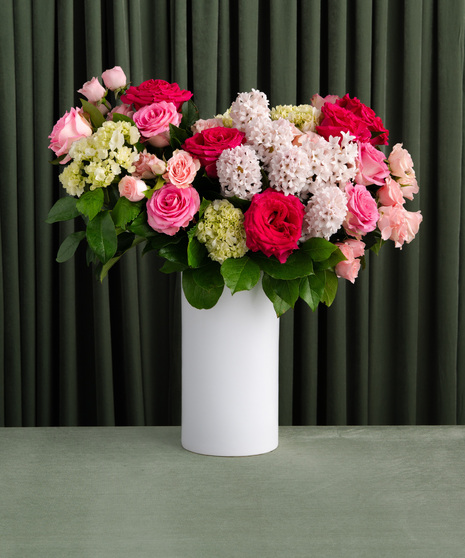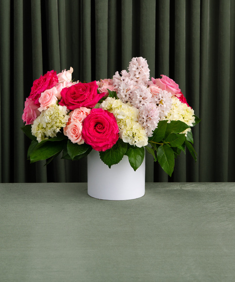 Petal Romance — Deluxe is a fuller, more luxurious expression of soft romance and vibrant spring beauty. This elevated design features an abundant blend of hot pink roses, soft pink roses, light green mini hydrangea, and fragrant blush hyacinth, creating a rich and layered floral composition.