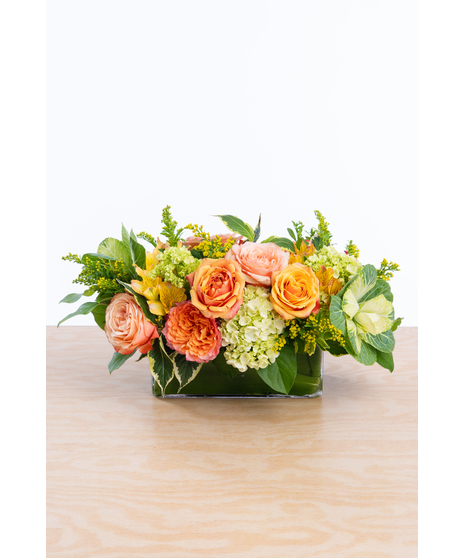 Step into a festive fall atmosphere where cheerful pumpkin hues swirl, joyful laughter gathers, and family traditions continue. Inspired by the timeless joy of autumn outings to the pumpkin patch, the “Pumpkin Patch” deluxe arrangement includes three varieties of glowing orange roses, mini green hydrangeas, white-green brassica, showy yellow alstroemerias, plumes of goldenrod, and seasonal foliage, arranged in a leaf-lined rectangular glass vase.