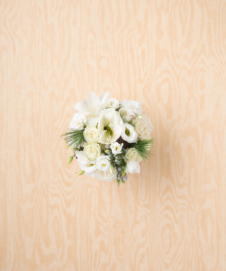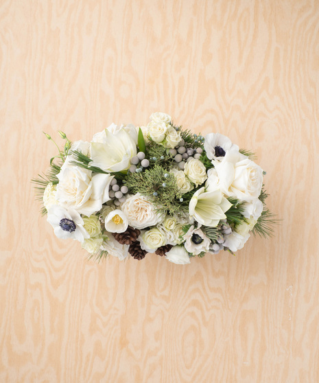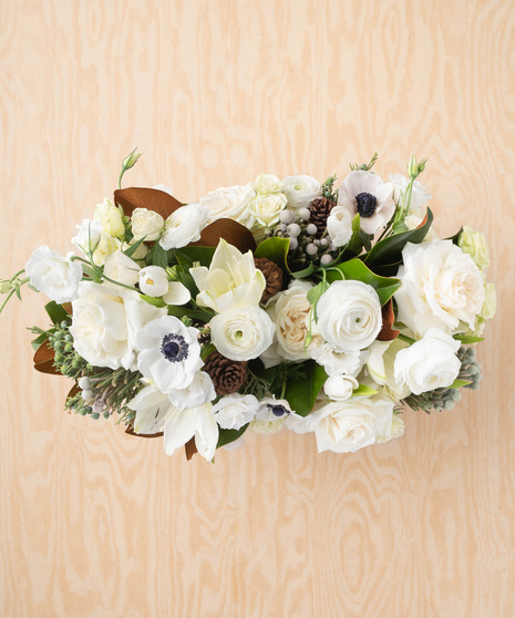 This classic-modern design is brimming with snow-white amaryllis, two-varieties of roses, tulips, lisianthus, anemones and ranunculus. Seasonal touches of silver brunia, Italian pine cones, and mixed evergreens styled in a keepsake gold vase create an elevated look.