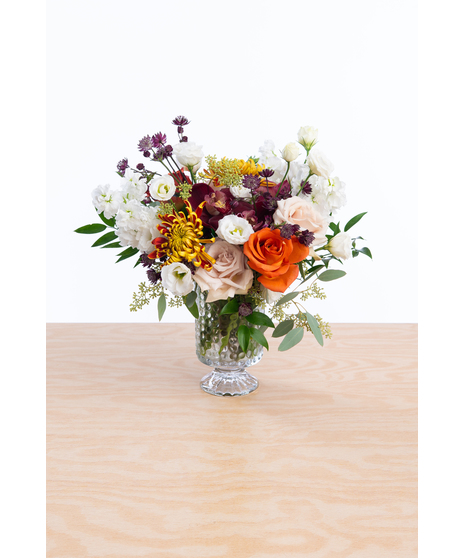 Cheers to Autumn with an elevated mix of muted blush and terracotta roses, golden-bronze chrysanthemums, airy white lisianthus, plush white stock, seasonal burgundy accents, and mixed greenery. Burgundy cymbidium orchids, nestled in a timeless footed glass vase, add a refined finishing touch.