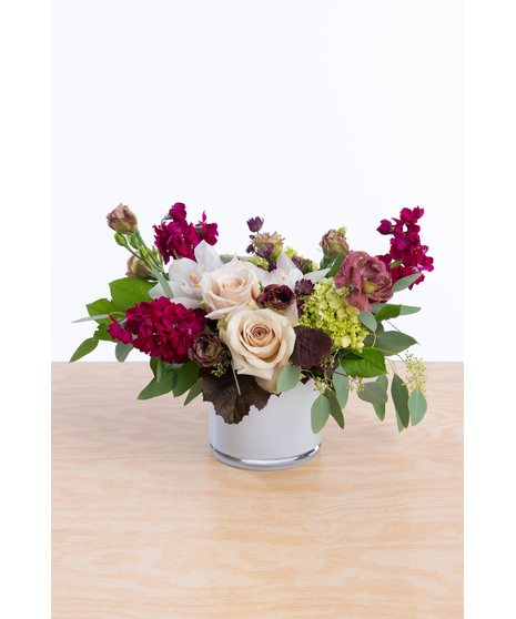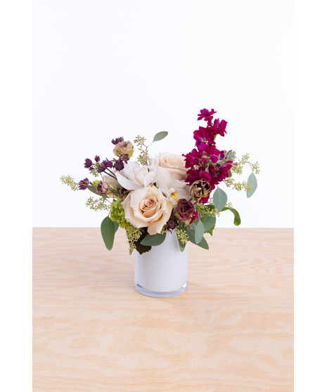 Sweet muted blush tones balanced with berry and earthy plum hues shine brilliantly in this modern arrangement, inspired by the sweetest nectar of the woods—maple syrup.